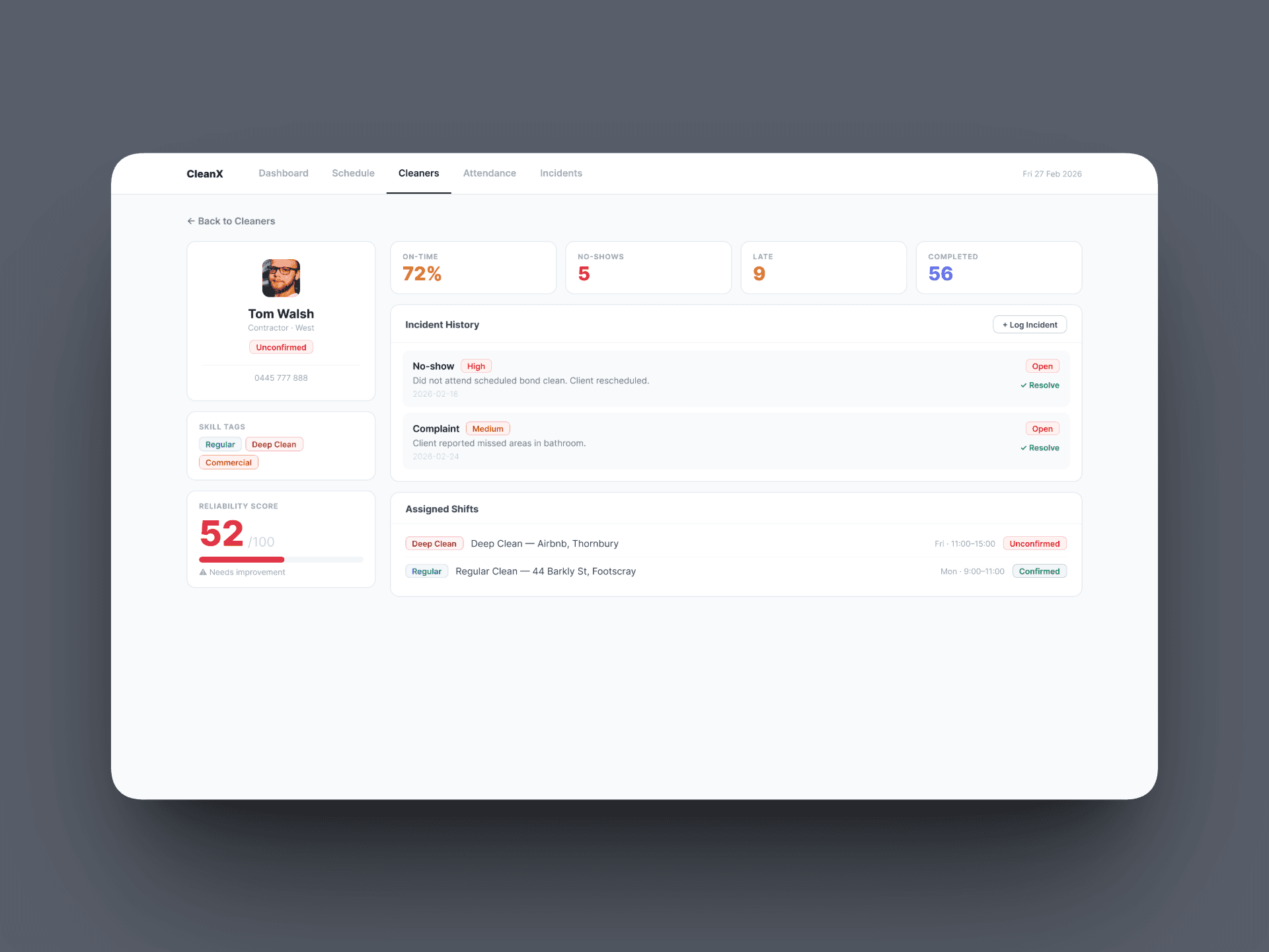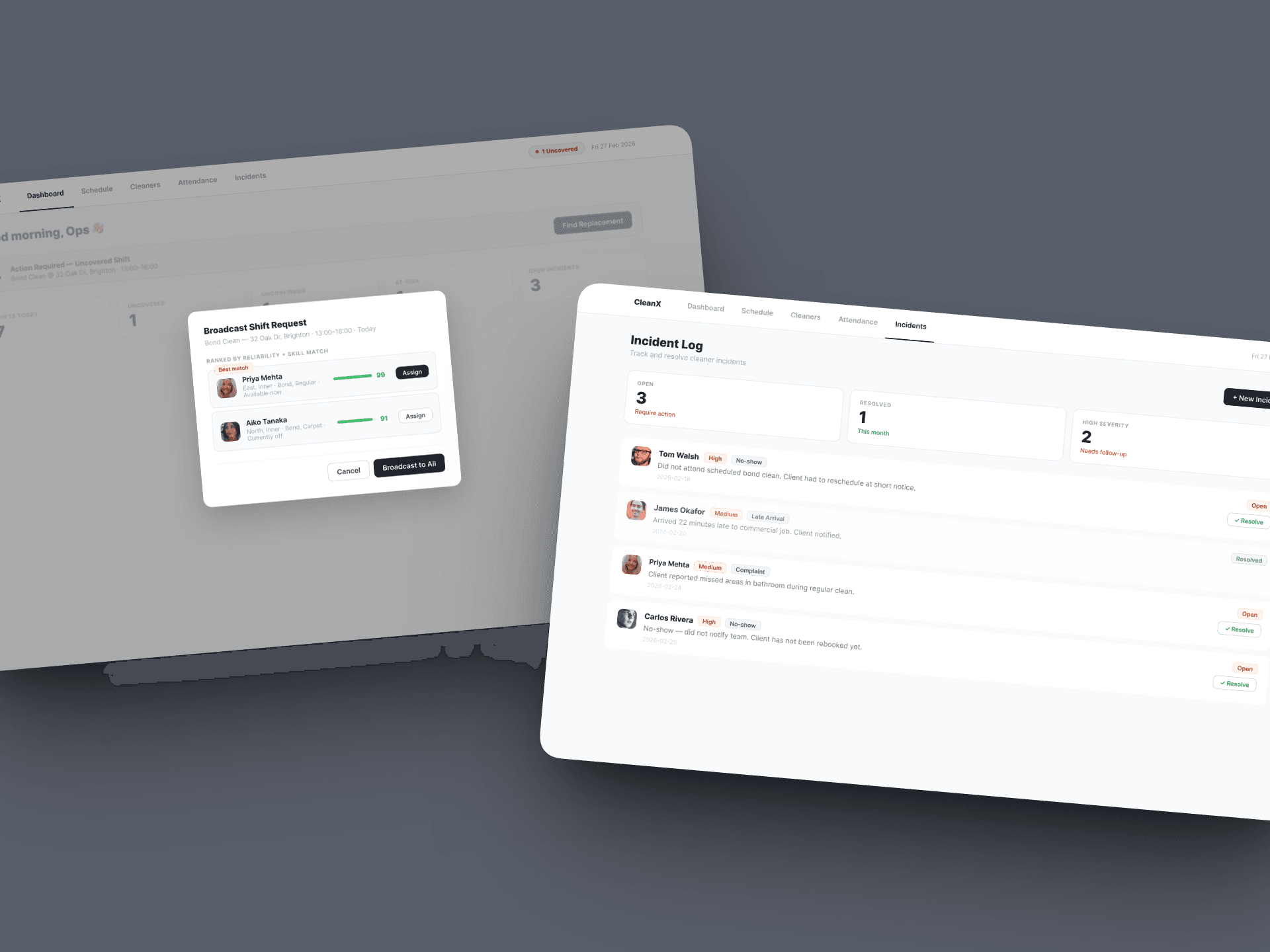 No-shows, complaints, and late arrivals are logged, severity-flagged, and linked to cleaner profiles. When a shift goes uncovered, the platform ranks available replacements by skill match and reliability score — managers resolve and reassign in one click, keeping the day on track.
