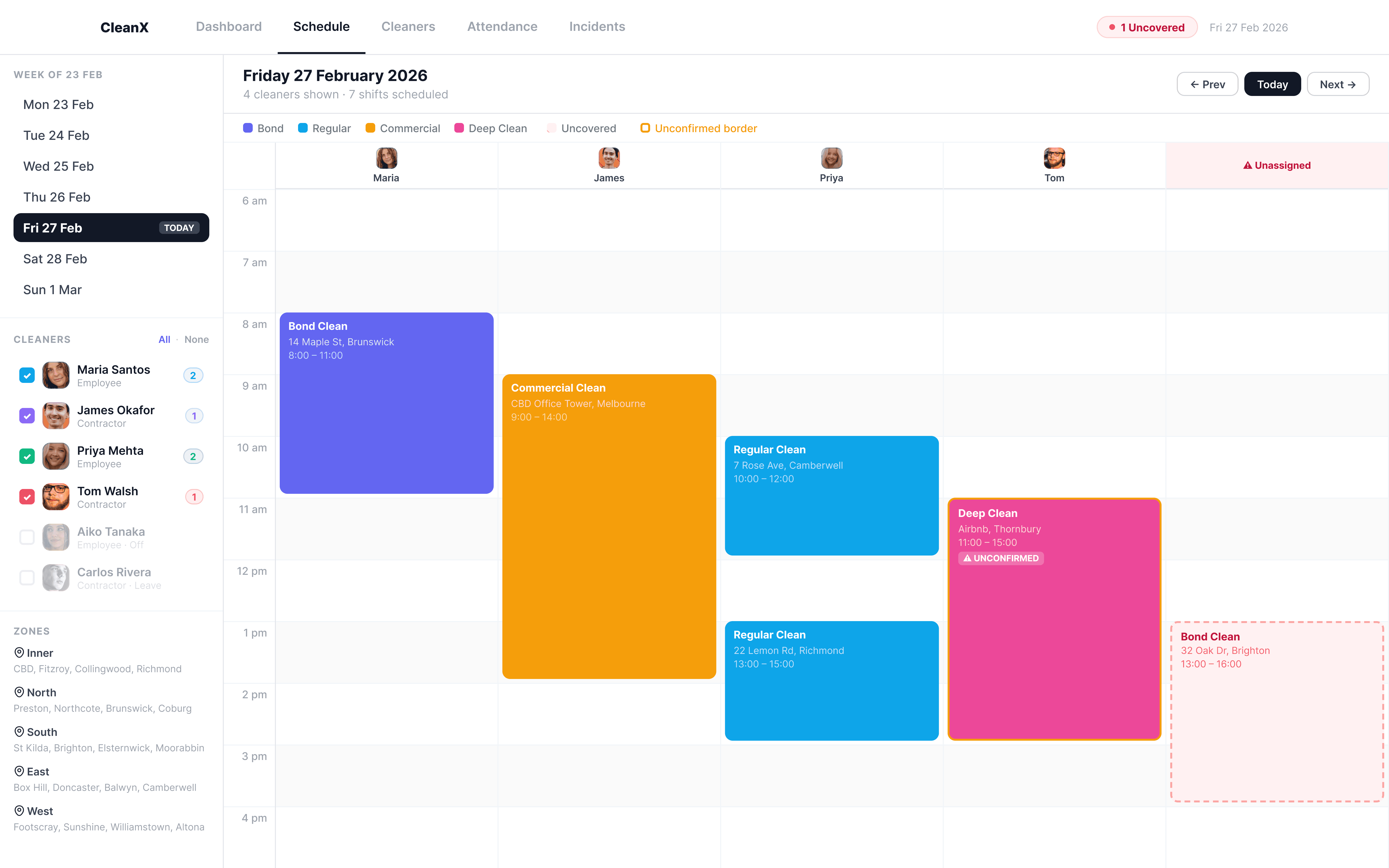 Each cleaner gets their own column on a full-day time grid. Uncovered shifts are impossible to miss. Managers toggle cleaners on and off to focus the view, keeping daily coordination fast and visual.