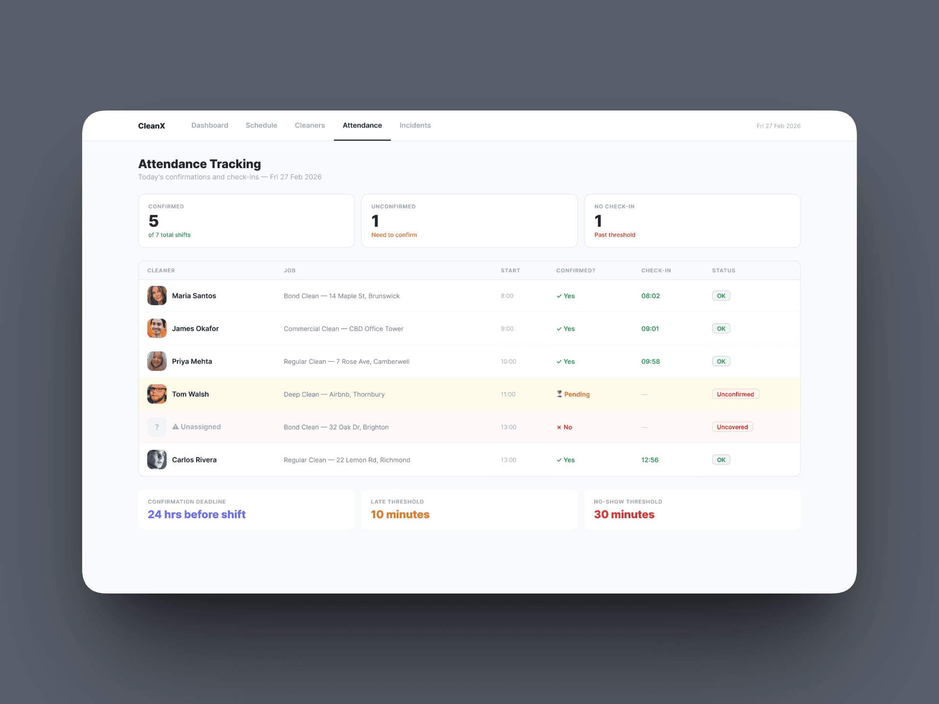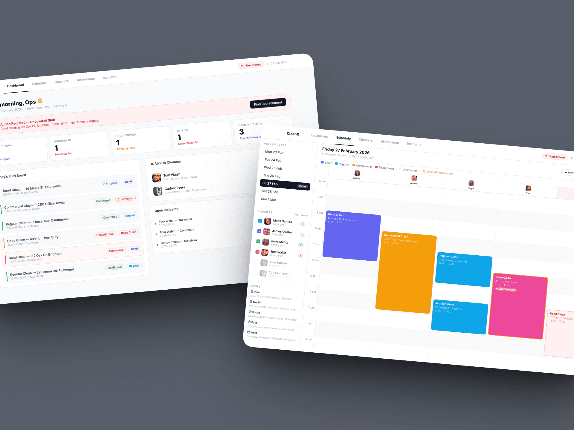 It gives ops managers full visibility across every cleaner and every shift, automates compliance monitoring around confirmations and check-ins, flags at-risk team members before they become liabilities, and ensures uncovered jobs are resolved before the day falls apart.