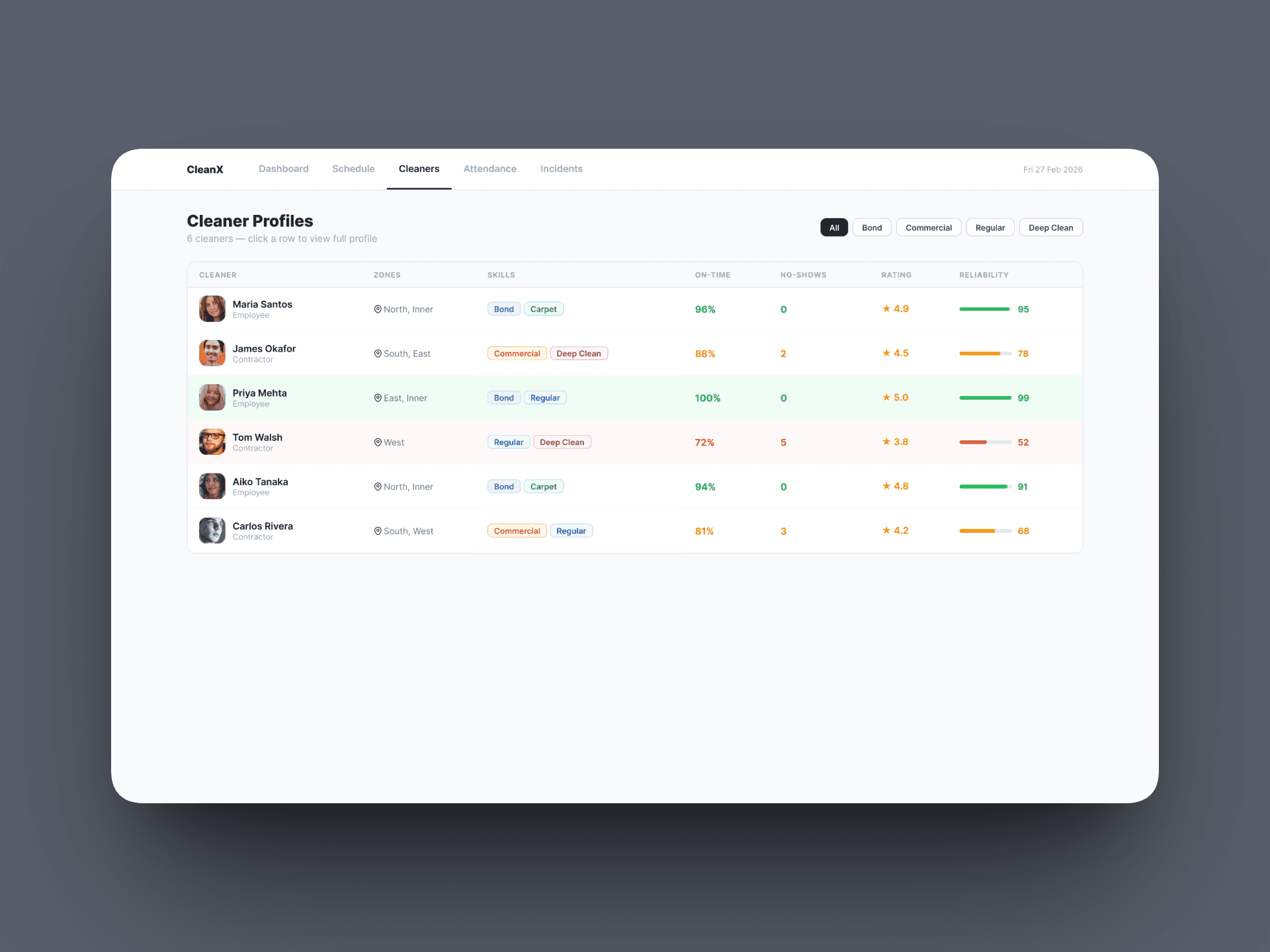 A centralised directory with reliability scores, skill tags, zone coverage, and incident history per cleaner. Managers know instantly who is cleared to work and who needs attention, without hunting across systems.