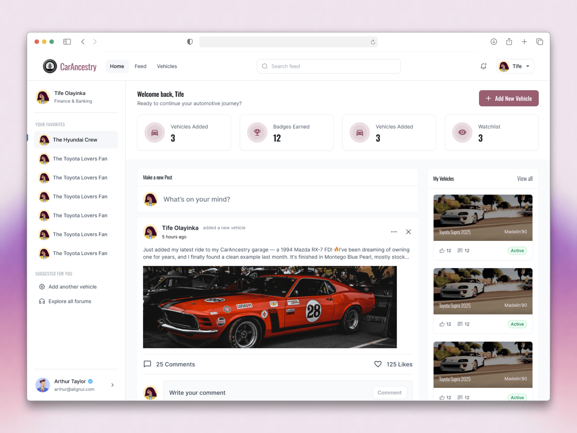 Each user has a personal profile that highlights their vehicles, posts, Panels, and community activity. Engagement-driven features such as badges and milestones reward participation and encourage users to contribute consistently. This creates a sense of progression while reinforcing community identity.